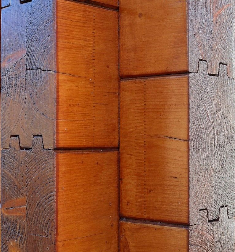 Travi sovrapposte orizzontalmente con incastri longitudinali maschio-femmina e fissate tra di loro con apposita ferramenta.