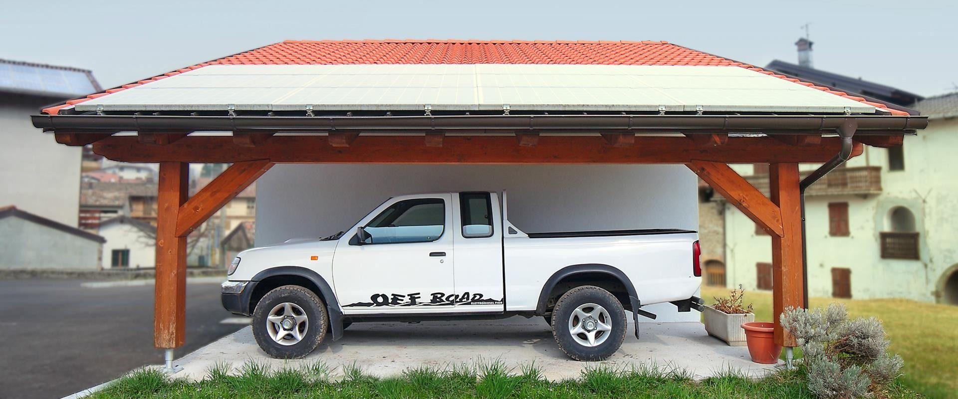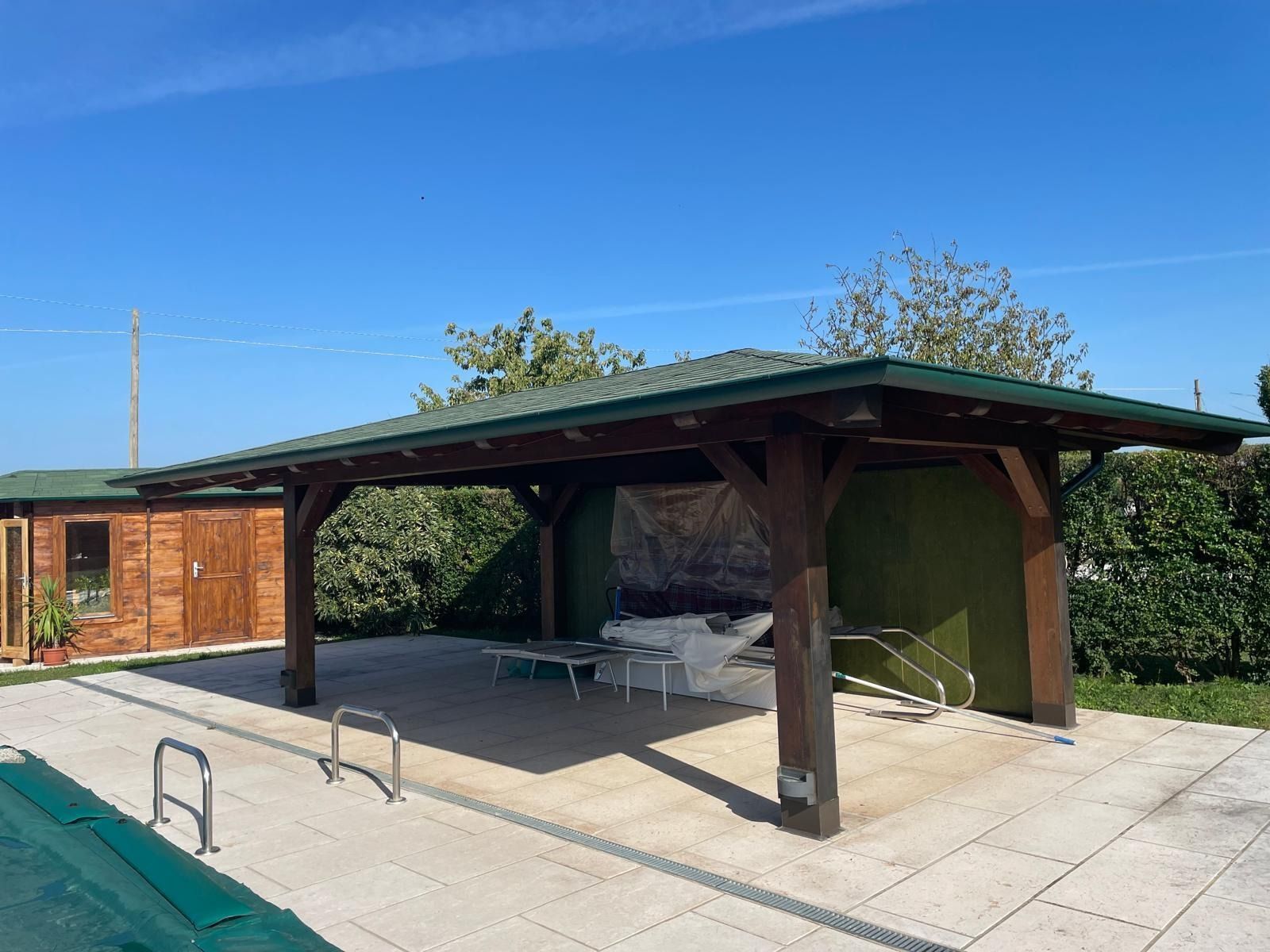 Struttura a pianta rettangolare con tetto in legno a padiglione, realizzata in legno LAMELLARE d’abete rosso – montanti, banchine, displuvi e colmo, mentre i correntini sono in legno BILAMA sempre in abete rosso.