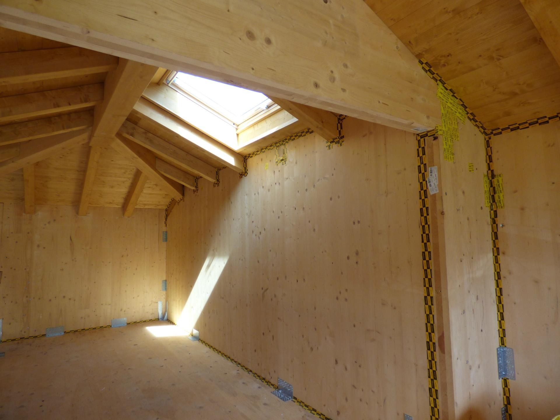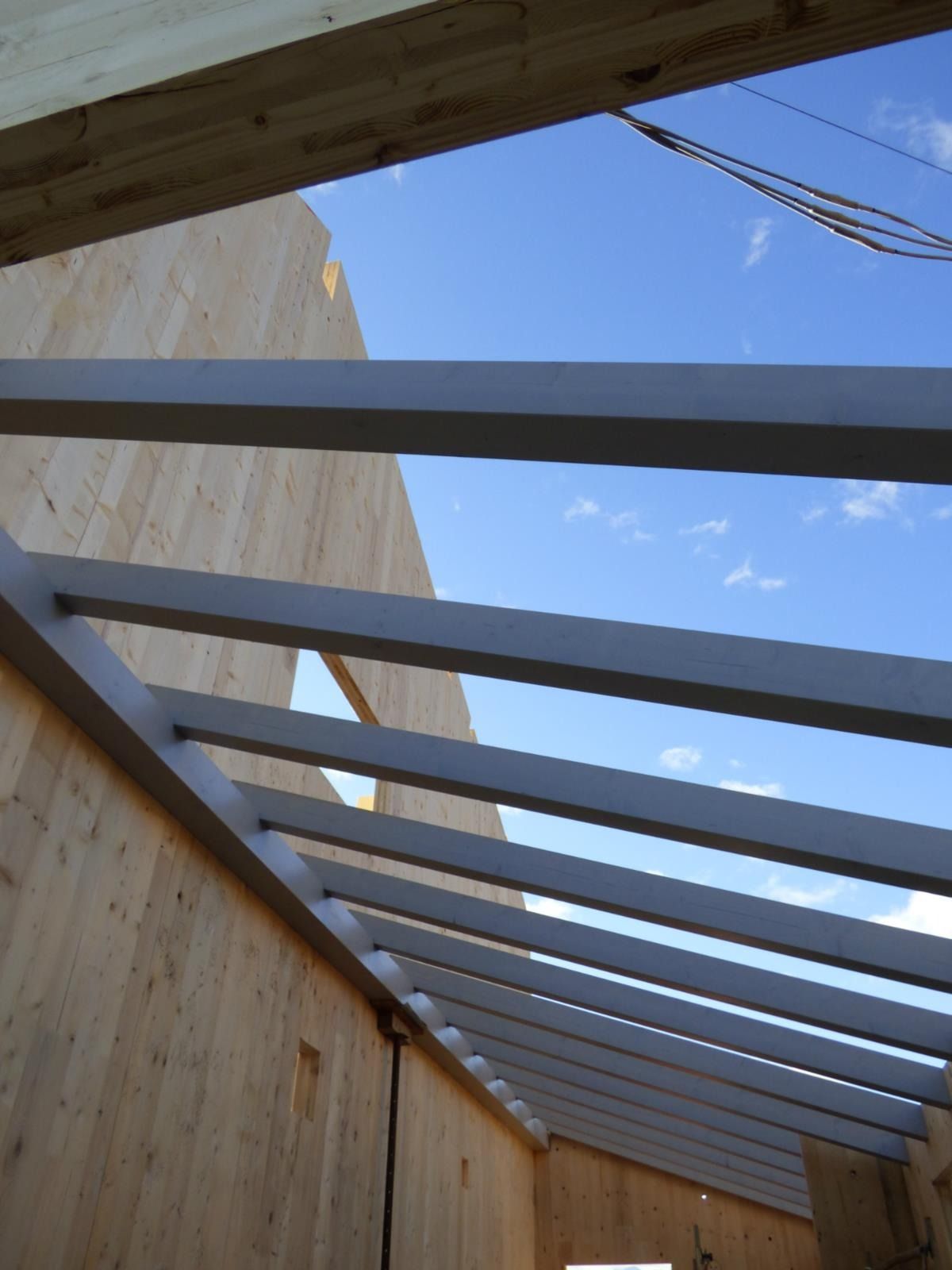 In questo caso il nostro compito si esaurisce con l’installazione delle pareti e solaio in X-LAM e della copertura, quest’ultima costituita da un’orditura principale il legno lamellare ed una secondaria in legno bi-lamellare, nonché del pacchetto isolante superiore.