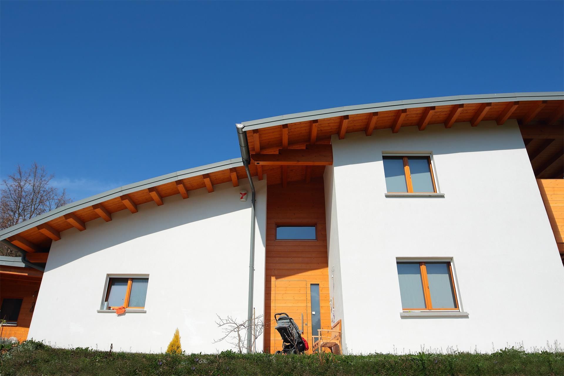 La particolarità visiva di questa casa in legno è dovuta ad un inedito tetto curvo, come da richiesta del committente. L'isolamento esterno a cappotto è stato realizzato con materiali naturali, come in questo caso, con lana di vetro ad alta densità.