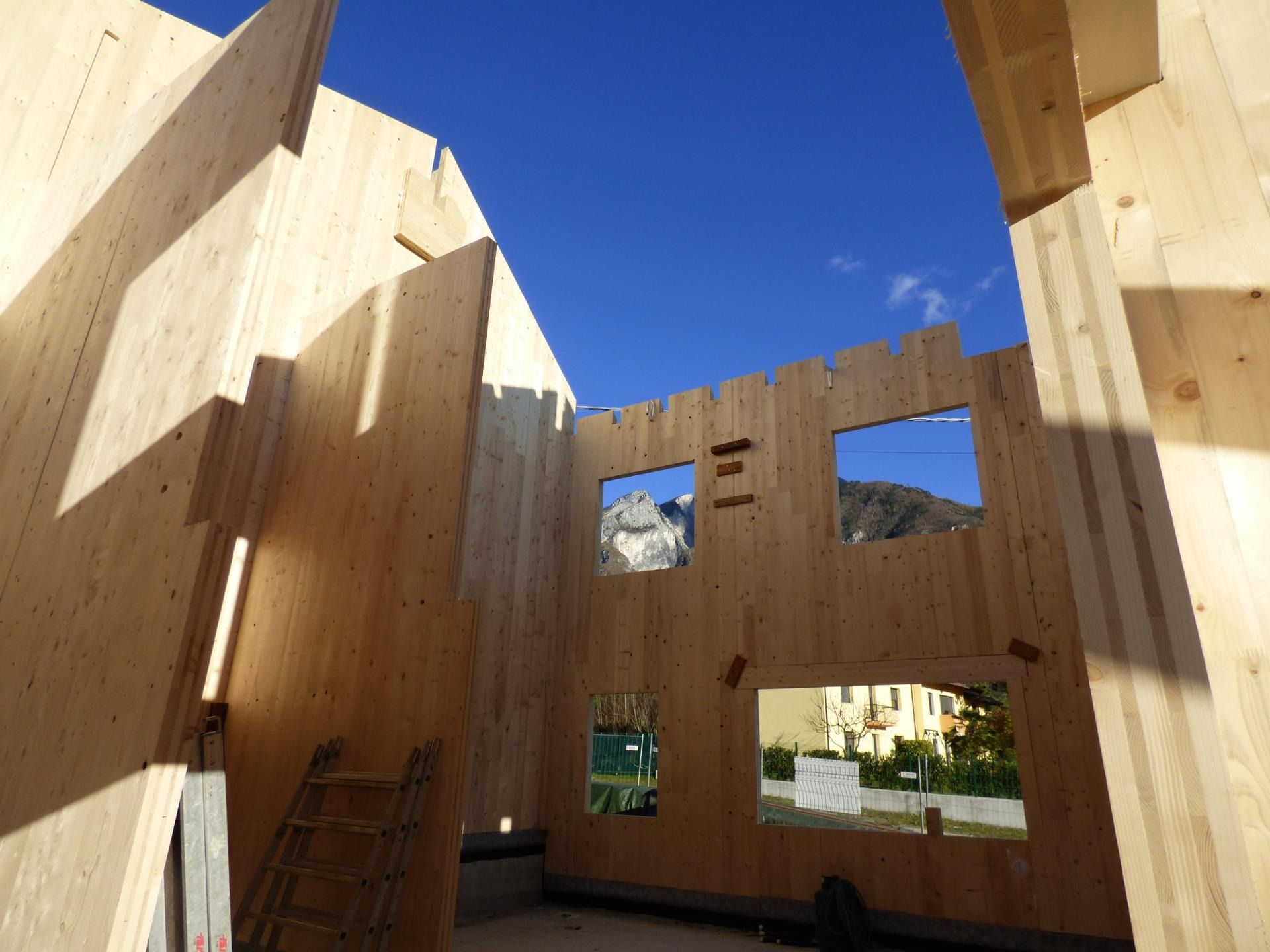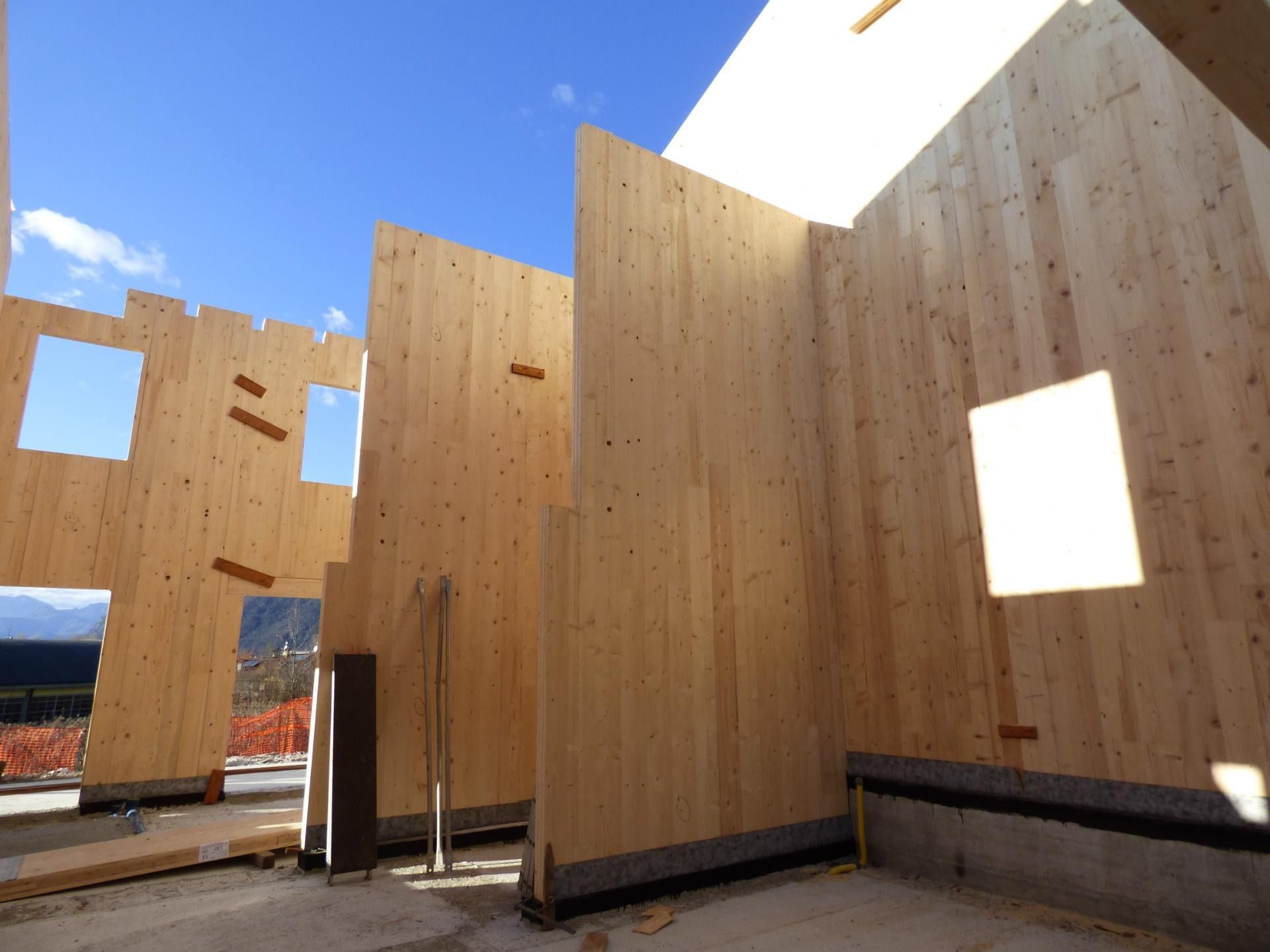 Le pareti sono costituite da pannelli in X-LAM a tre strati di spessore 120 mm, mentre il solaio del soppalco è realizzato sempre in X-LAM, ma a cinque strati e con spessore complessivo di 160 mm.