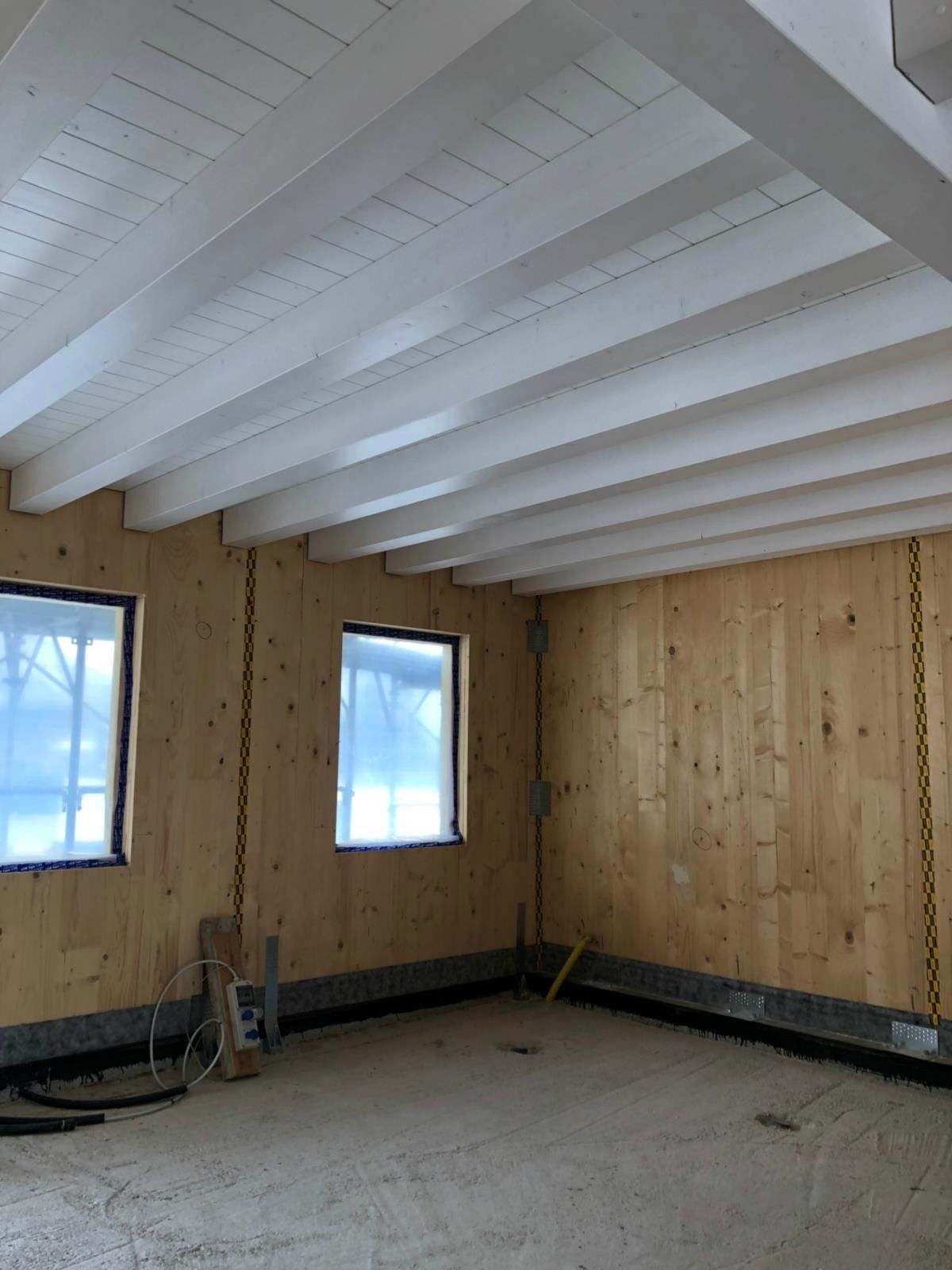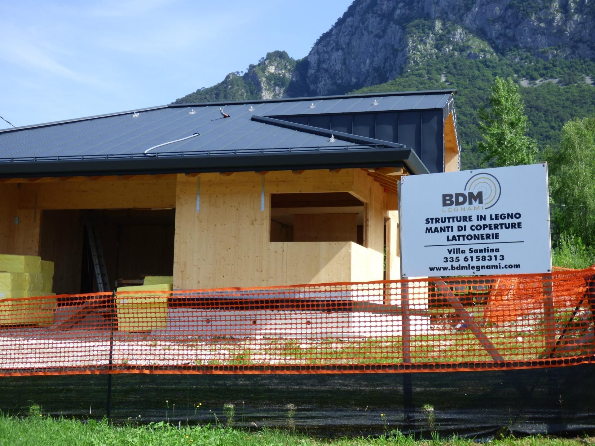 In questo caso il nostro compito si esaurisce con l’installazione delle pareti in X-LAM, del solaio in legno, della struttura portante di copertura, quest’ultima costituita da un’orditura il legno lamellare e legno bi-lamellare, del tavolato grezzo superiore e di una guaina impermeabilizzante.