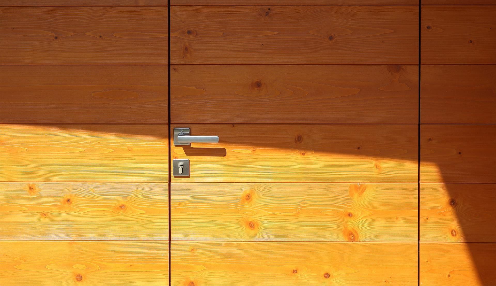 Sulla superficie esterna delle pareti è stata posizionata una membrana resistente ai raggi uv, due strati di isolante (con listellatura) incrociati fra loro x evitare ponti termici, TAVOLATO e LISTELLI COPRIFUGA in LARICE PIALLATO. Questi ultimi sono stati fissati alla struttura sottostante con viteria in acciaio inossidabile e con testa colorata.
